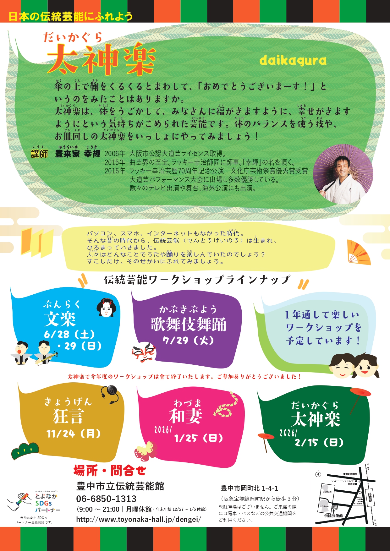 色々な種類の伝統芸能をお子様に知ってもらい、体験していただけるワークショップを行います。
