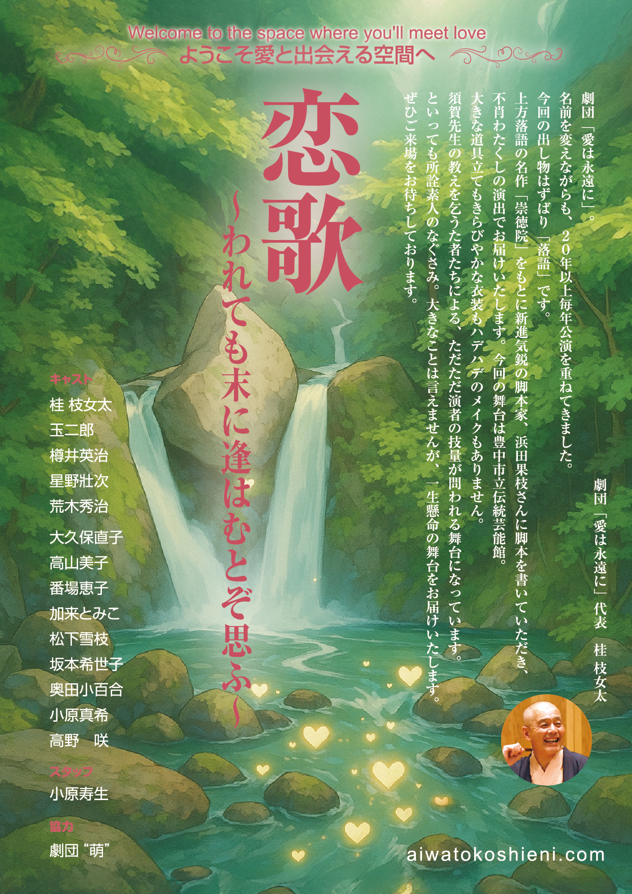 貸館 落語芝居「恋歌~われても末に逢はむとぞ思ふ~」 チラシをクリックしてください。裏面をご覧いただけます。 問い合わせ先 劇団「愛は永遠に」 gekidan@aiwatokoshieni.com 公演・イベント一覧へ戻る