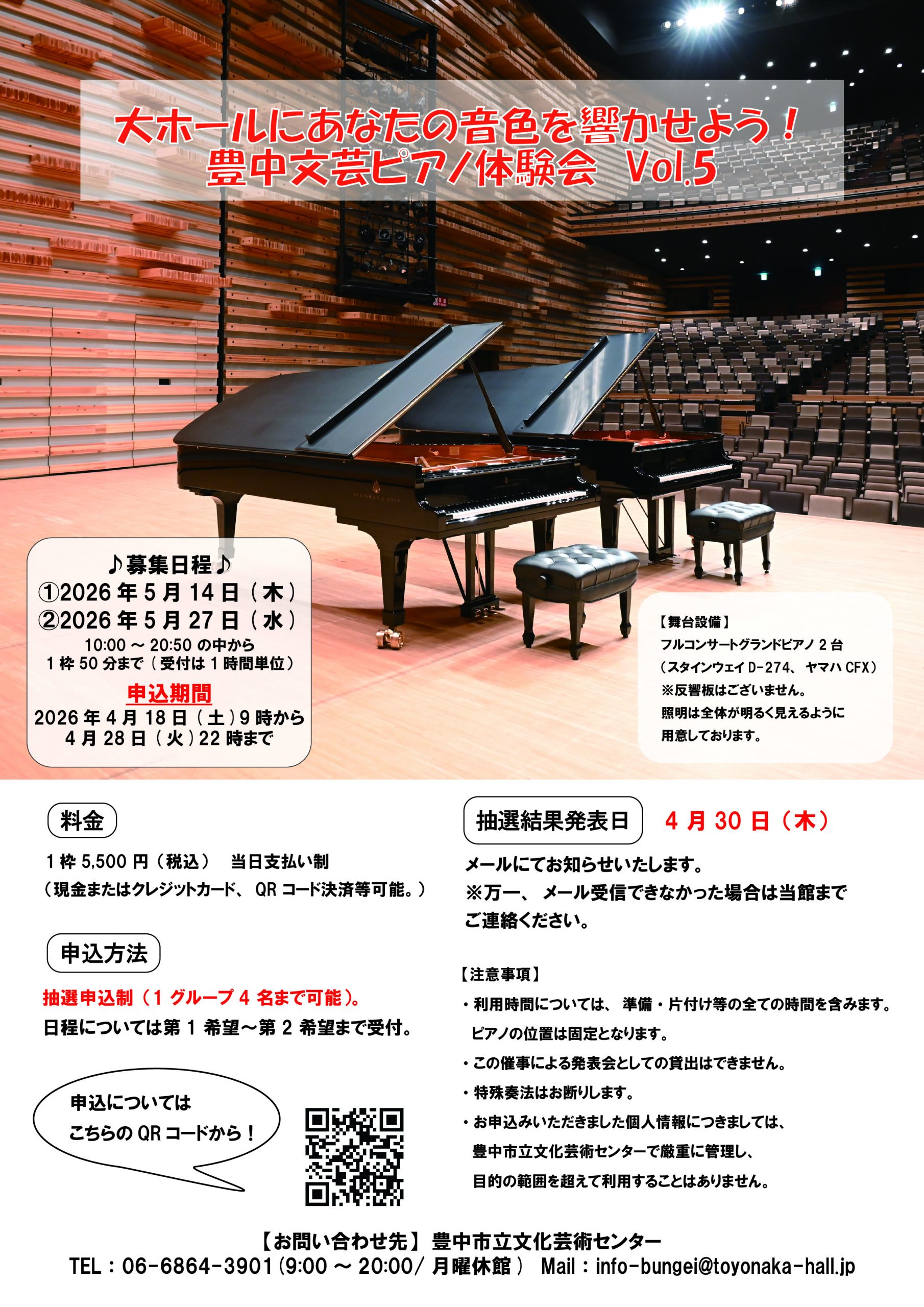 先月から募集しておりました「大ホールにあなたの音色を響かせよう!豊中文芸ピアノ体験会」